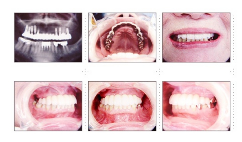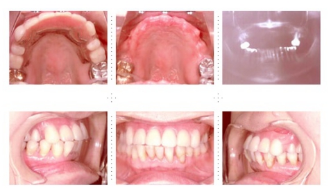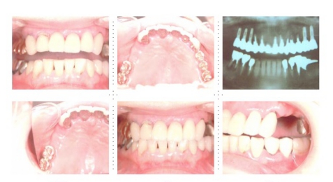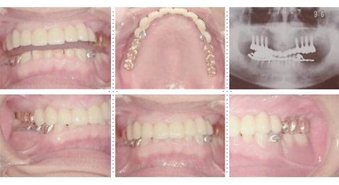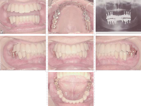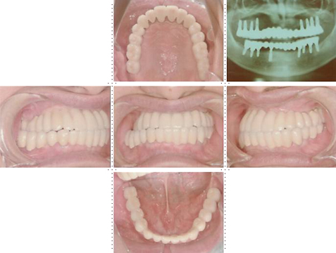 下顎は両側犬歯を残し、他は抜歯。インプラント7本埋入。 上顎はインプラント8本埋入。 インプラント手術を受けられる患者さんは、前の晩眠れない程の不安感、恐怖心を持って来院されます。実際には麻酔注射は痛みを感じず、インプラント手術も痛みも無く、短時間(1本平均3分)で終わるという、当院独自のテクニックにより、2回目からのインプラント手術は気楽になるようです。 前歯は仮歯の段階で患者さん、歯科医、技工士の三者で、審美性・機能性の面から10回以上形態修正を繰り返し検討した後、上・下顎共に前歯・小臼歯はセラミック(MB)クラウン、大臼歯はゴールドクラウンを装着。ご本人とご家族の方にも、「アンチエイジングには、審美インプラント治療が一番効果あり」と大変喜んで頂きました。