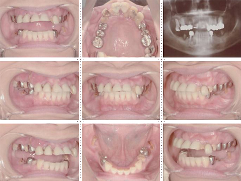 このケースは局部床義歯の維持の為、犬歯を残し、抜歯後にすぐに入れられる義歯を使いながら、骨のあるところから適宜インプラントを埋入することで治療期間も負担も少なくてすみます。 インプラントは上顎8本、下顎8本を埋入しました。左下の奥は骨のしっかりしたところに傾斜埋入しました。 このような全顎ブリッジケースの咬み合わせは非常に難しいのですが、TEK(仮歯)を使った咬合採得方法にしてからはほぼ無調整でセットできるようになりました。 この咬合採得テクニックはインプラントセミナーで紹介し好評でした。