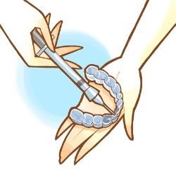 ホームホワイトニングキットをお渡しして、カスタムトレーにジェルを注入し実際に装着して液が漏れたり知覚過敏がおきないかしばらく様子をみます。(歯科医師・歯科衛生士の前でジェル注入&トレイ装着の練習できるので安心です。)
