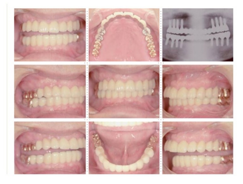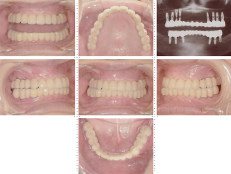上顎左右奥に4本ずつ計8本のインプラント埋入。下顎左右奥に3本ずつ計6本のインプラント埋入上下顎とも全体的にセラミックを使用した冠をセット。