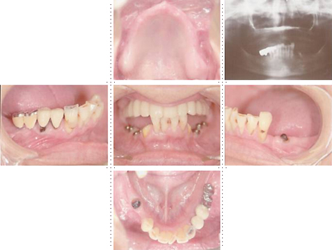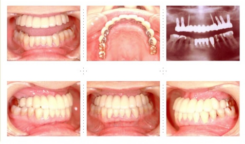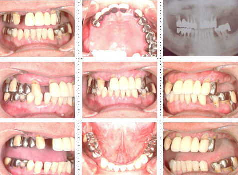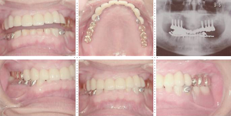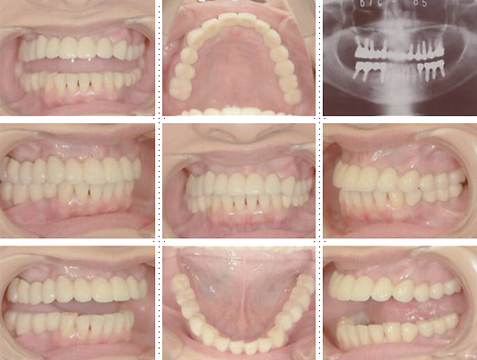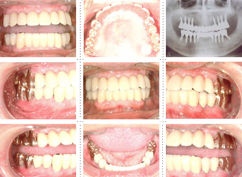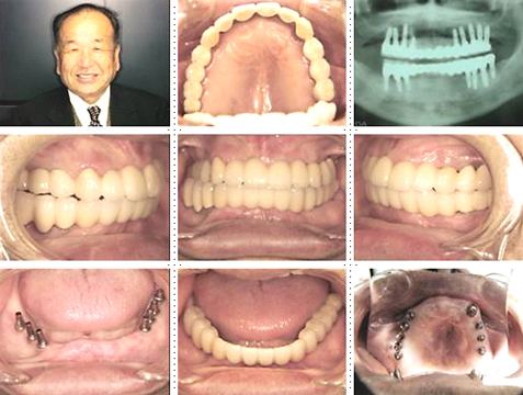 下顎は両側犬歯を残し、他は抜歯。インプラント7本埋入。 上顎はインプラント8本埋入。 インプラント手術を受けられる患者さんは、前の晩眠れない程の不安感、恐怖心を持って来院されます。実際には麻酔注射は痛みを感じず、インプラント手術も痛みも無く、短時間(1本平均3分)で終わるという、当院独自のテクニックにより、2回目からのインプラント手術は気楽になるようです。 前歯は仮歯の段階で患者さん、歯科医、技工士の三者で、審美性・機能性の面から10回以上形態修正を繰り返し検討した後、上・下顎共に前歯・小臼歯はセラミック(MB)クラウン、大臼歯はゴールドクラウンを装着。ご本人とご家族の方にも、「アンチエイジングには、審美インプラント治療が一番効果あり」と大変喜んで頂きました。