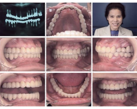 上顎1本の歯だけを残し、インプラント8本埋入。下顎は歯を抜き、インプラント7本埋入。上下顎とも、セラミック(MB)クラウンをセット。仕事・生活ともに活力が出て、新しい人生が始まったようであると喜んでいただきました。